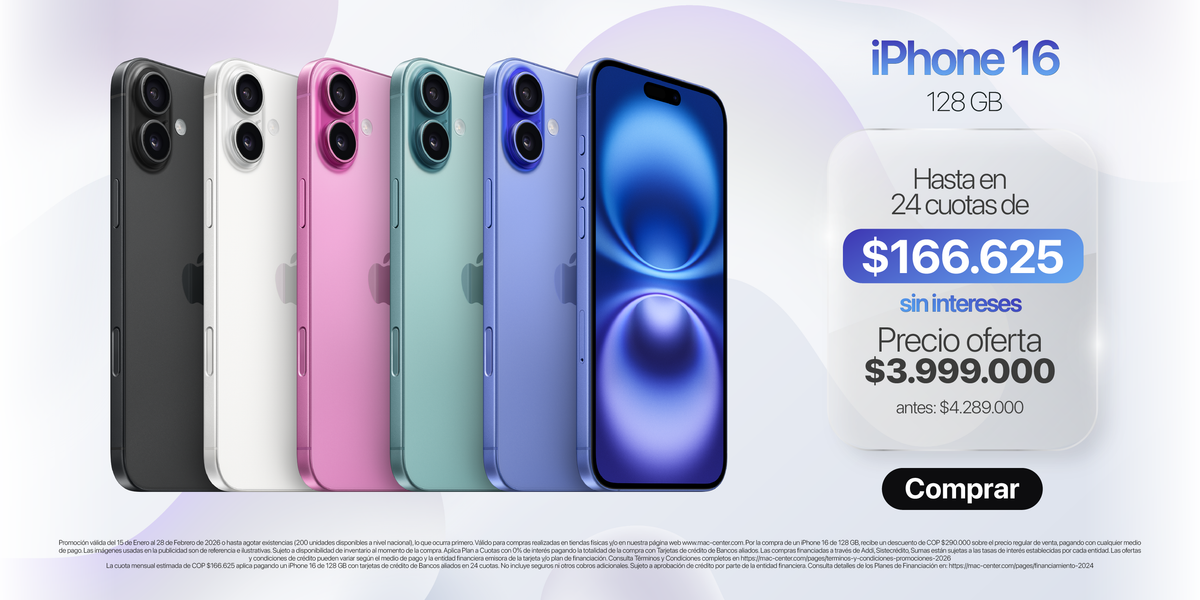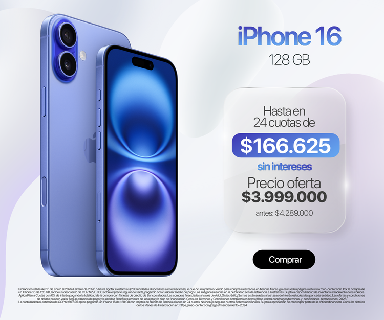 iPhone 16 Disponible en Oferta desde $3.999.000 con 0% de interés.